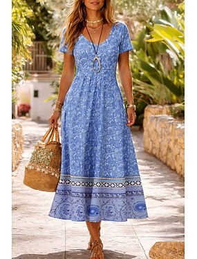 Damen Midikleid Boho-Kleid Sommerkleid Freizeitkleid Ethnokleid Elegant Bohemien Urlaub Strand Ferien Date Normale Passform Blumen Grafik Paisley-Muster Kurzarm V Ausschnitt Blau Rosa Purpur Orange
