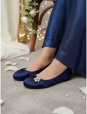 Hochzeitsschuhe für die Mutter der Braut/des Bräutigams, marineblaue Satin-Ballerinas für Damen, flache Hochzeitsschuhe mit niedrigem Absatz und Strasssteinen, bequeme Abendpumps