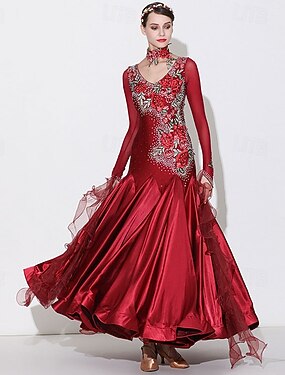 Elegantes rotes Ballkleid für Damen mit Strass-Blumenstickerei, V-Ausschnitt, geeignet für Walzer, Tango, Modern Rumba, Wettbewerbe und Aufführungen