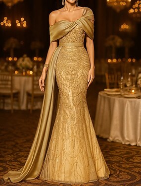 Meerjungfrauenschnitt Bodenlange Schleppe Abendkleid Ballkleid mit Überrock Festliche Kleidung Elegant Promi-Stil Halbarm Schulterfrei Formell Hochzeit Paillettenbesetzt mit Falten