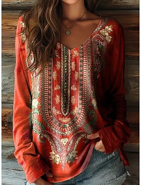 Damenbluse Tunika V-Ausschnitt Langarm Boho Lässig Oberteile Floral Grafik Elegant Vintage Tägliche Reguläre Oberteile Täglicher Druck Weiß Pink Blau Staubiges Blau Lila