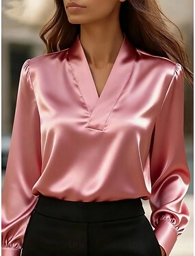 Damenbluse aus Satin, einfarbig, elegant, stilvoll, für Büro und Freizeit, langärmelig, V-Ausschnitt, reguläre Passform, schwarz, weiß, rosa, khaki, für Frühling und Herbst