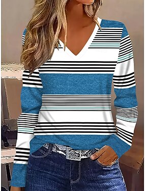 Damen T-Shirt Langarm Grafik Geometrisch Gestreift Vintage Stilvoll Klassisch Langarm V-Ausschnitt Regulär Tops Alltag Druck Royal Blau Himmelblau Frühling Herbst Winter Vorsaison