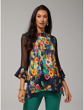 Damenbluse schwarz Blumendruck Stretch Chiffon Ärmel Bateau-Ausschnitt lässig täglich Frühling Sommer Herbst