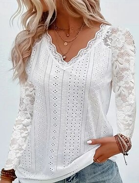Damen Hemd Bluse Spitze Patchwork Einfarbig Basic Lässig Langarm V Ausschnitt Normale Oberteile Täglich Weiß Herbst Winter