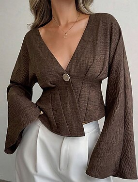 Damen Sommerhemd Freizeithemd Bluse Gerafft Knöpfe Asymmetrischer Saum Einfarbig Einfach Elegant Stilvoll Lässig Langarm Glockenärmel V Ausschnitt Crop Tops Täglich Ferien Ausgehen Braun Frühling