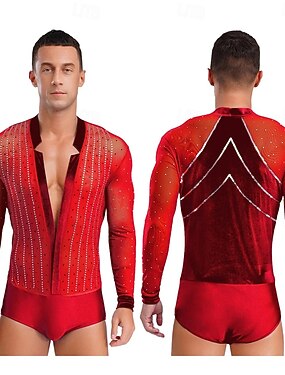 Herren roter Strass-Lateintanz-Body mit tiefem V-Ausschnitt, Netzstoff und langen Ärmeln, Ballsaal-Auftrittskostüm