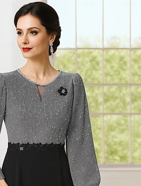 A-Linie Meerjungfrauenschnitt Knielang Cocktailkleid Langarm Rundhalsausschnitt Elegant Vintage Party Hochzeitsgast Polyester Brautmutterkleid mit Paillette Farbblock