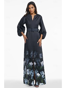 Schlauchkleid Bodenlang Abendkleid Figurbetontes Kleid Dreiviertelarm V Ausschnitt Elegant Party Hochzeitsgast Satin Spitze Brautmutterkleid mit Applikationen Kaskadierende Rüschen Blume