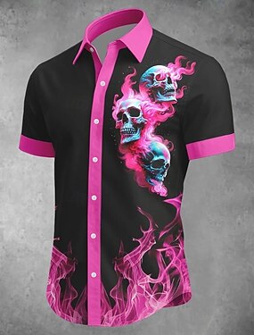 Herren Kostüme Schädel Shirt Sommer Hemd Button Up Shirt Kurzarm Dunkler Gothic Stil Feiertag Sommer Frühling Umschlag 3D Druck Kragen Hemden Vorne Eine Tasche Schwarz Pink Blau Orange Grün