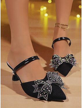 Strassbesetzte Damen-Mules mit Schleife – funkelnde, spitz zulaufende Slipper mit niedrigem Absatz und doppelten Riemen, glamouröser Party-Style für den Abend &Abend in der Stadt