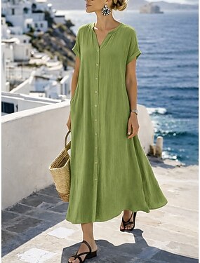 Maxikleid für Damen aus Leinenimitat, A-Linie, lässig, locker geschnitten, kurzärmelig, V-Ausschnitt, blau, schwarz, weiß, camel, Sommer, Frühling, Herbst
