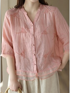 Damen Bluse Kunstbaumwollleinen Bestickt Knöpfe Einfarbig Stilvoll Lässig Dreiviertelarm Rundhalsausschnitt Normale Oberteile Täglich Weiß Gelb Rosa Purpur Orange Sommer Frühling Herbst