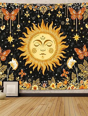 Sonnen-Wandteppich, himmlisch, Boho-Stil, Schmetterlinge, Sterne, Blumen, Yoga-Raum, Meditationsdeko, spirituelle Zen-Kunst, Stoffposter für das Wohnzimmer