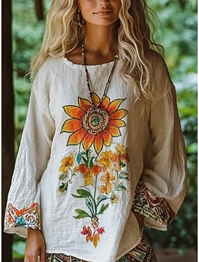 Damen Hemd Boho-Hemd Bluse Druck Blumen Bohemien Vintage Hawaiianisch Langarm Rundhalsausschnitt Normale Oberteile Täglich Ausgehen Strandbekleidung Weiß Sommer Frühling Herbst