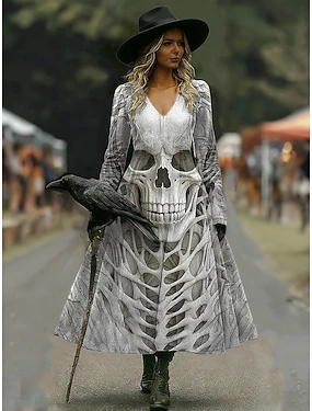 Damen Schädel Druck Midi Kleid A-Linien Kleid Urlaub Casual Alltag Regulär Fit Grafik Schädel Langarm V-Ausschnitt Blau Orange Grau Herbst Winter