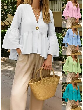 Damen Bluse Baumwollhemd Kunstbaumwollleinen Gerafft Rüsche Einfarbig Stilvoll Basic Lässig Langarm V Ausschnitt Normale Oberteile Täglich Blau Weiß Rosa Himmelblau Grün Sommer Frühling Herbst