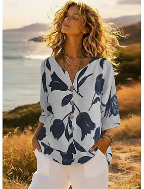 Damen Hemd Knopfleiste Bluse Kunstbaumwollleinen Knöpfe Druck Grafik Elegant Täglich Stilvoll Dreiviertelarm V Ausschnitt Normale Oberteile Täglich Ferien Ausgehen Weiß Rosa Rote Grün Violett Sommer