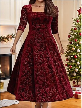 Weihnachten Damen Samt Maxi Kleid Etuikleid A-Linie Kleid Fit and Flare Kleid Party Geburtstag Festliche Party Hochzeitsgast Geburtstag Einfarbig Lange Ärmel Quadrat Wein Grün Frühling Herbst Winter
