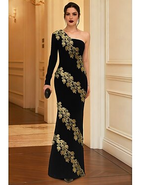 Meerjungfrauenschnitt Bodenlang Abiballkleider Abendkleid Ballkleid Festliche Kleidung Elegant Glitzernd Promi-Stil Langarm Ein-Schulter Formell Hochzeit Spitze Stretch-Crêpe mit Stickerei