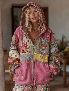 Damen 3D Druck Vintage Boho Hoodie Patchwork Hoodie Sweatshirt Floral Zip Up s Floral Punk Aktiv Vintage Langarm Kapuzen Reguläre Tops Zuhause Alltagskleidung Lässig Rosa Rot Beige Herbst Winter