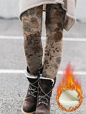 Damen Leggings Gemütliche Leggings Vintage Mode Streetwear Volle Länge Hohe Taille Blumen Grafik Drucken Fleece Thermowarm Bequem Dehnbar Outdoor Alltagstauglich Braun Herbst Winter Schmale Passform