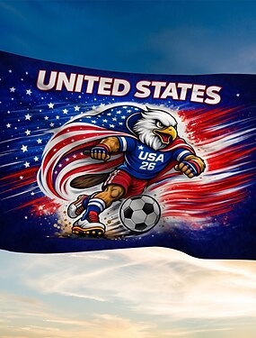 Flagge der Vereinigten Staaten – dynamischer Adler als Maskottchen im USA-Trikot Nr. 26, der einen Fußball kickt, sternenbesetzter Hintergrund, lebendig &langlebig