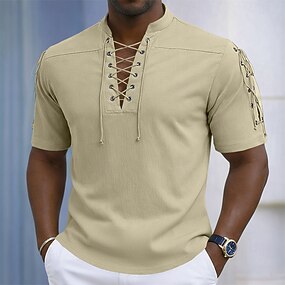 Herren Hemd Freizeithemd Knopfhemd Blau Schwarz Weiß Braun Aprikose Kurzarm Einfarbig Einfach Großvaterkragen Lässig Täglich Kordelzug Bekleidung Elegant Mode Lässig