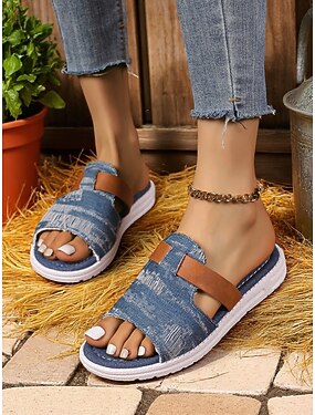 Damen-Slipper aus Denim mit Kunstlederakzenten, rustikal-schickes Landhaus-Design für Grillabende im Garten, Spaziergänge auf dem Land und den lässigen Alltag