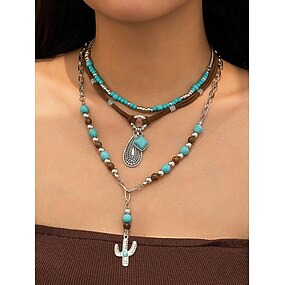 Damen-Set aus mehrlagigen türkisfarbenen Perlen im Western-Stil – Statement-Schmuck im Boho-Stil mit Kaktus- und Tropfenanhängern, ideal für Festivals, Country-Konzerte und die Freizeit