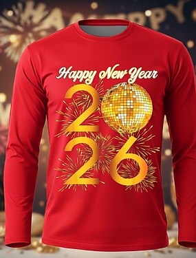 Neujahr Herren glückliches neues Jahr 2026 T Shirt Langarm T-Shirt 3D-Druck Rundhalsausschnitt Hemd Übertrieben Designer Künstlerisch Club Party Straße Blau Schwarz Rote Herbst Winter Bekleidung S M