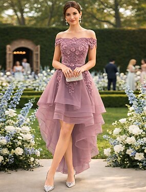A-Linie Asymmetrisch Abiballkleider Blumen High-Low Kurzarm Schulterfrei Abschlussball Hochzeitsgast Tüll mit Applikationen