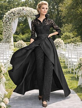 Overall Hosenanzug Bodenlang Brautmutterkleid Dreiviertelarm Hemdkragen Vintage Party Formell Hochzeitsgast Formeller Abend Satin Spitze mit Raffung