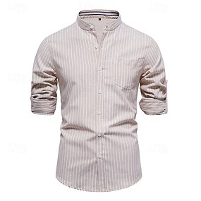 Herren Hemd Hemd mit chinesischem Kragen Hemd mit Stehkragen Kleidhemd Knopfhemd Gestreift Hochzeit Party Kaki Langarm Großvaterkragen Frühling & Herbst Bekleidung
