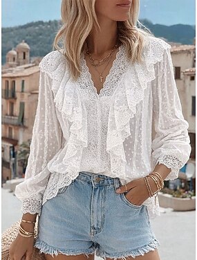 Damen Bluse Spitze Rüsche Einfarbig Stilvoll Lässig Langarm V Ausschnitt Normale Oberteile Täglich Weiß Beige Sommer Frühling Herbst