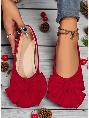Rote Ballerinas für Damen mit großer Schleife – elegante Abendschuhe mit quadratischer Spitze für Partys, Weihnachten und Alltagsoutfits