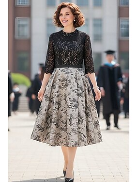 A-Linie Tee-Länge Partykleid Cocktailkleid Kleid für Hochzeitsgäste Brautmutterkleid Halbarm Rundhalsausschnitt Elegant Bauch verstecken Satin Spitze mit Spitze Falten Druck
