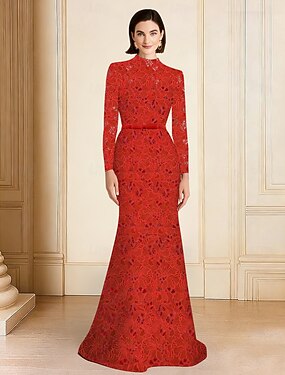 Meerjungfrauenschnitt Bodenlang Abiballkleider Abendkleid Ballkleid Festliche Kleidung Elegant Glitzernd Promi-Stil Langarm Hoher Ausschnitt Formell Hochzeit Spitze Samt mit Schleife(n) Applikationen