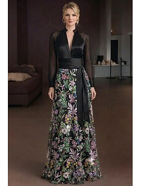 A-Linie Bodenlang Perlenbestickt Abendkleid Kleid der Brautmutter Abendkleid Festliche Kleidung Elegant Glitzern Blumen Langarm V Ausschnitt Hochzeit Formell Capes Satin Spitze mit Glitzer Gestickte