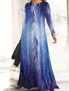 Damen Skelett Maxi Kleid Schlüpfer Kleid A Linie Kleid Lässig Boho Hochzeitsgast Strand Reguläre Passform Florales Grafik Lange Ärmel Crew Neck Boot Neck Blau Purpur Orange Grün Frühling Herbst Winter