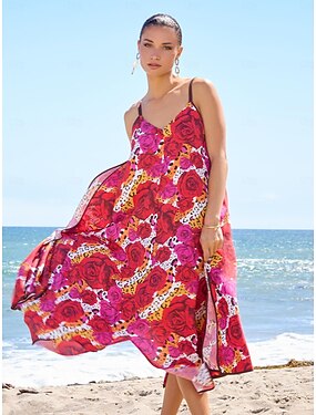 Damen Trägerkleid Sommerkleid Druckkleid Midikleid Rote Gurt Druck Rose Blumen V-Ausschnitt Druck Asymmetrischer Saum Frühling & Sommer V Ausschnitt Sexy V-Ausschnitt Urlaubskleid Urlaub S M L