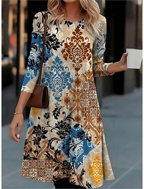 Damen Midikleid Etui-Kleid T-Shirt-Kleid A Linie Kleid Sportliches Kleid Urlaub Lässig Boho Täglich Normale Passform Blumen Grafik Geometrisch Langarm Rundhalsausschnitt Leicht Braun Hellgrau Sommer