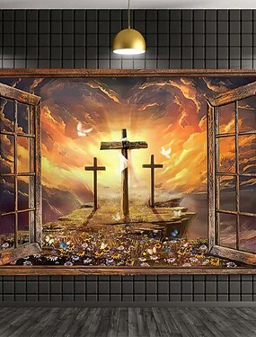 Ostern, christlich, religiös, drei Kreuze, Sonnenuntergang, Fensteransicht, Wandteppich, Heiliger Geist, Tauben, Kalvarienberg, Landschaft, Wandbehang, spirituelle Heimdekoration, Gebetsraum, Kirche,