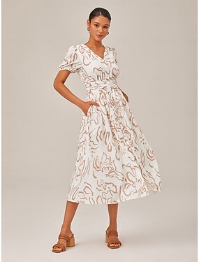 Damen Weiblich Freizeitkleid Midikleid Schwarz-Weiß Kurze Ärmel Blumenmuster Palme Palmblatt Drucken Sommer V Ausschnitt Urlaub Lässig Freizeit XS S M