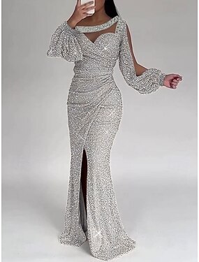 Pailletten-Rüschen Etuikleid Säulenabendkleid Elegantes festliches Kleid Formelle Hochzeit Bodenlang Langarm Eine Schulter Pailletten mit Falten Schlitz