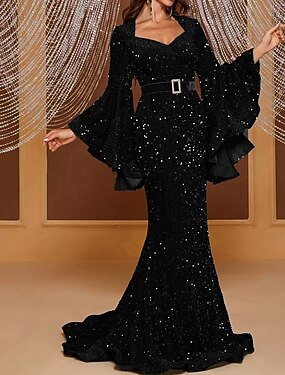 Meerjungfrauenschnitt Schlauchkleid Bodenlang Abiballkleider Abendkleid Ballkleid Festliche Kleidung Elegant Glitzernd Promi-Stil Langarm V Ausschnitt Formell Hochzeit Paillettenbesetzt mit Glitzer