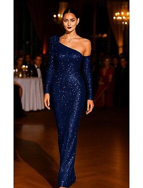 A-Linie Schlauchkleid Bodenlange Schleppe Abiballkleider Abendkleid Ballkleid Festliche Kleidung Elegant Glitzernd Promi-Stil Langarm Ein-Schulter Formell Hochzeit Satin Stretch Satin mit Gerafft