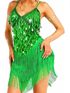 Latein-Tanzkleid mit Pailletten, Fransen und Quasten, Damen-Performance-Partykleid, ärmellos, kurze Ärmel, hoher Polyester-Lycra-Gehalt