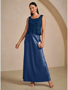 Elegantes Maxikleid für Damen, A-Linie, Satin, Abendkleid, Partykleid, Spitze, Glitzer, normale Passform, florales Muster, ärmellos, eckiger Ausschnitt, marineblau