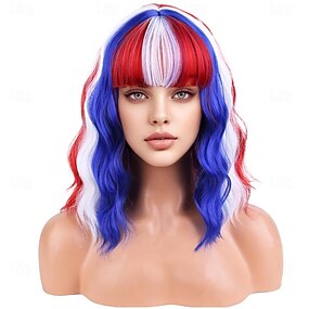 Rote weiße und blaue Perücken für Frauen und Mädchen 4. Juli Perücken kurze lockige gewellte Perücken mit Pony Perücke für die 4. Juli-Party